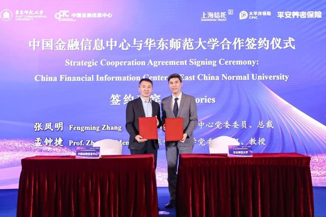 开幕式后,华东师范大学与中国金融信息中心的合作签约仪式隆重举行。华东师范大学党委副书记孟钟捷,中国金融信息中心党委委员、总裁张凤明作为双方代表签署合作协议。双方将充分发挥华东师范大学在养老金融、大数据、人工智能及软件工程领域的跨学科教学与科研优势以及中国金融信息中心的全媒体平台优势,围绕信息发布、智库研究、高素质金融人才培养、高端论坛活动策划及举办、人工智能等前沿领域探索等方向展开深度合作。此次战略合作不仅标志着双方在政策研究、人才培养与科研创新等多领域、多层次的深度合作迈出了坚实步伐,更为服务国家积极老龄化战略、推动金融信息服务业智能化升级贡献智慧与力量。